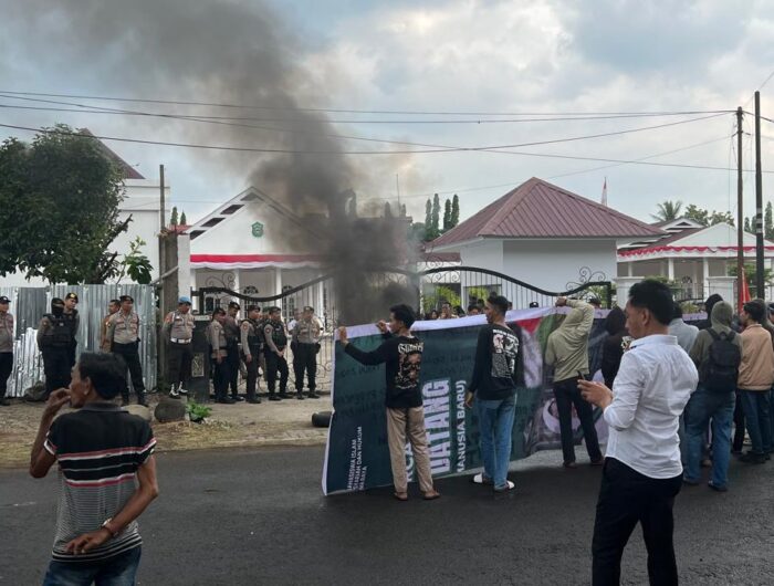 TAKALAR, FINGERS–Puluhan orang mengatasnamakan aliansi mahasiswa dan pemuda Takalar menggugat menggelar aksi unjuk rasa di depan Rumah Jabatan (Rujab) Bupati Takalar, Kelurahan Kalabbirang, Kecamatan Pattassang, Senin (8/9/2025).